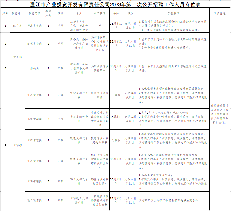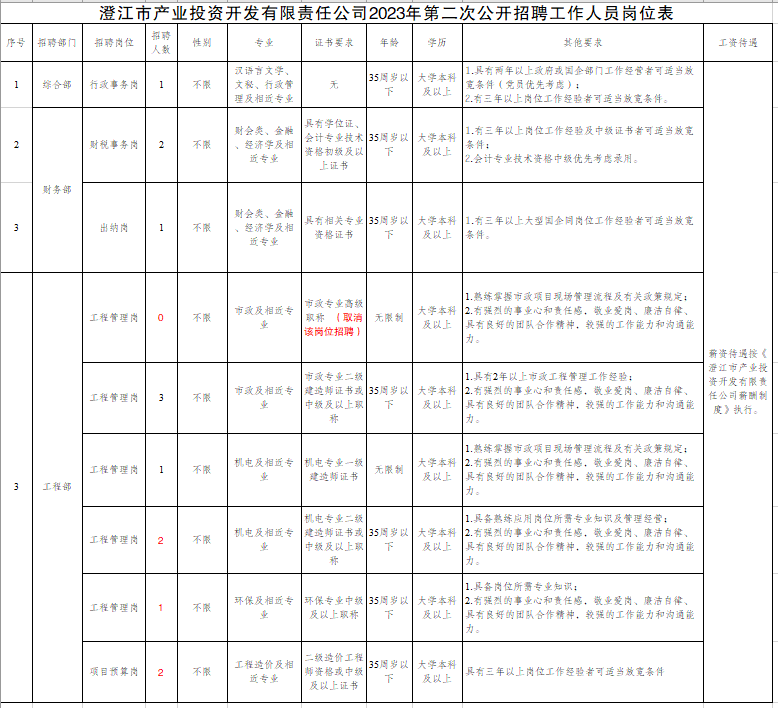 根據(jù)《澄江市產(chǎn)業(yè)投資開(kāi)發(fā)有限責(zé)任公司2023年第二次公開(kāi)招聘工作人員公告》的報(bào)名情況,經(jīng)研究,決定:取消工程管理市政高級(jí)崗崗位招聘;工程管理機(jī)電專(zhuān)業(yè)二建崗原招聘1人調(diào)整為招聘2人、工程管理環(huán)保中級(jí)崗原招聘2人調(diào)整為招聘1人、工程管理項(xiàng)目預(yù)算崗原招聘1人調(diào)整為招聘2人,其余崗位不變,具體如下: