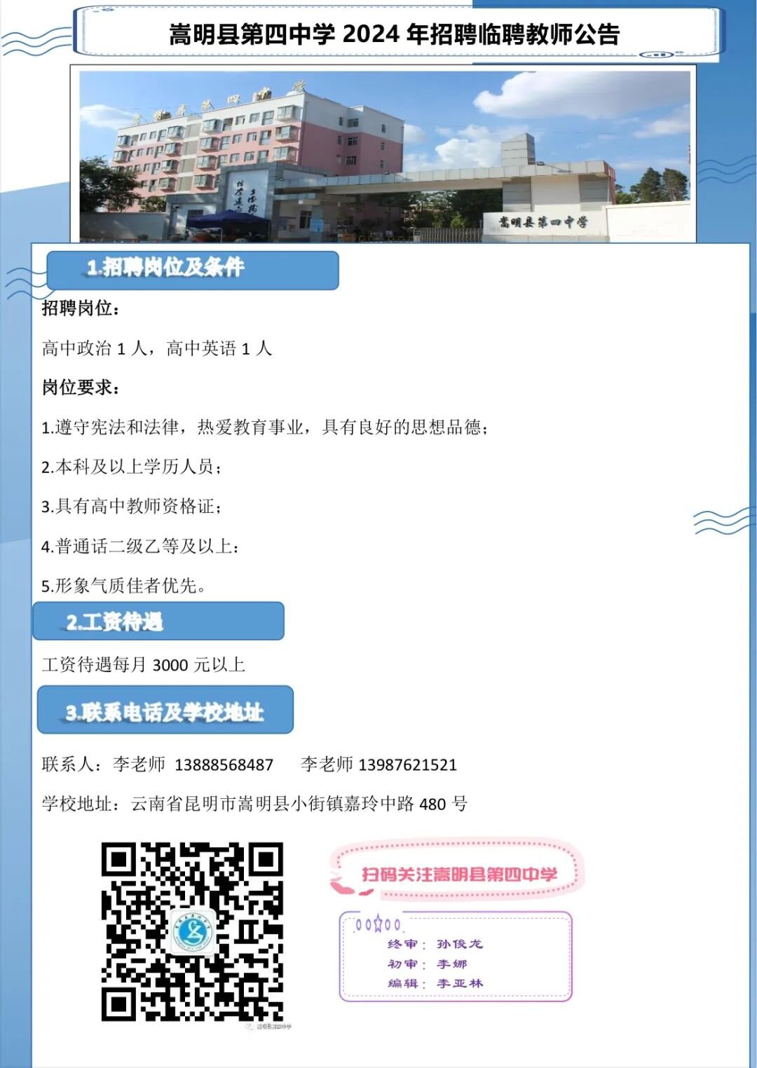 2024年昆明市嵩明縣第四中學招聘臨聘教師公告