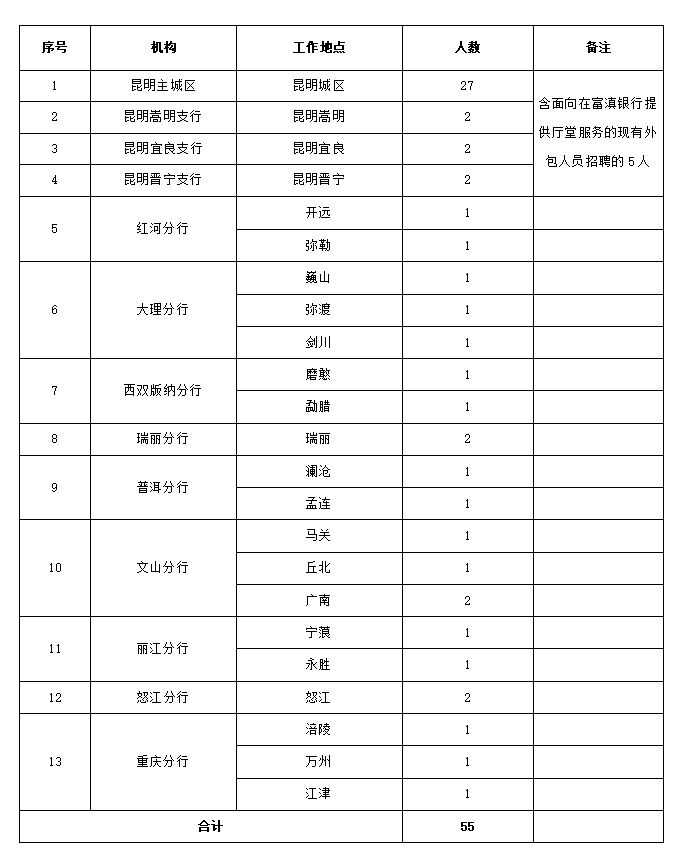 本次計(jì)劃招聘共55人,安排到富滇銀行昆明主城區(qū)、昆明郊縣支行及州市分行從事輔助性業(yè)務(wù)崗位。具體如下: