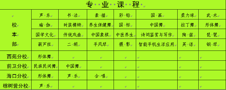 2024學(xué)年校本部計(jì)劃開(kāi)設(shè)音樂(lè)、舞蹈、器樂(lè)、傳統(tǒng)文化、書(shū)畫(huà)、生活、體育七個(gè)系,28個(gè)專(zhuān)業(yè),36個(gè)教學(xué)班級(jí);分校計(jì)劃開(kāi)設(shè)音樂(lè)、舞蹈兩個(gè)系,4個(gè)專(zhuān)業(yè),8個(gè)教學(xué)班級(jí)。(各班級(jí)上課時(shí)間及招生人數(shù)詳見(jiàn)附件1、附件2)