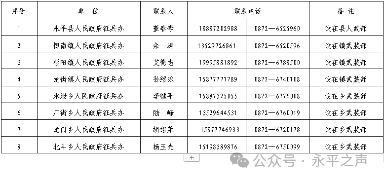 永平縣人民政府征兵辦公室咨詢電話:0872-6525960,監(jiān)督電話:0872-6525961。
