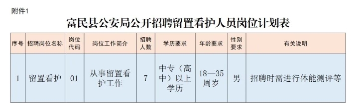 本次公開招聘留置看護(hù)人員共計(jì)7人(限男性),報(bào)名人數(shù)不足7人則按實(shí)際報(bào)名人數(shù)削減崗位開考,詳見富民縣公安局公開招聘留置看護(hù)人員崗位計(jì)劃表(附件1)。