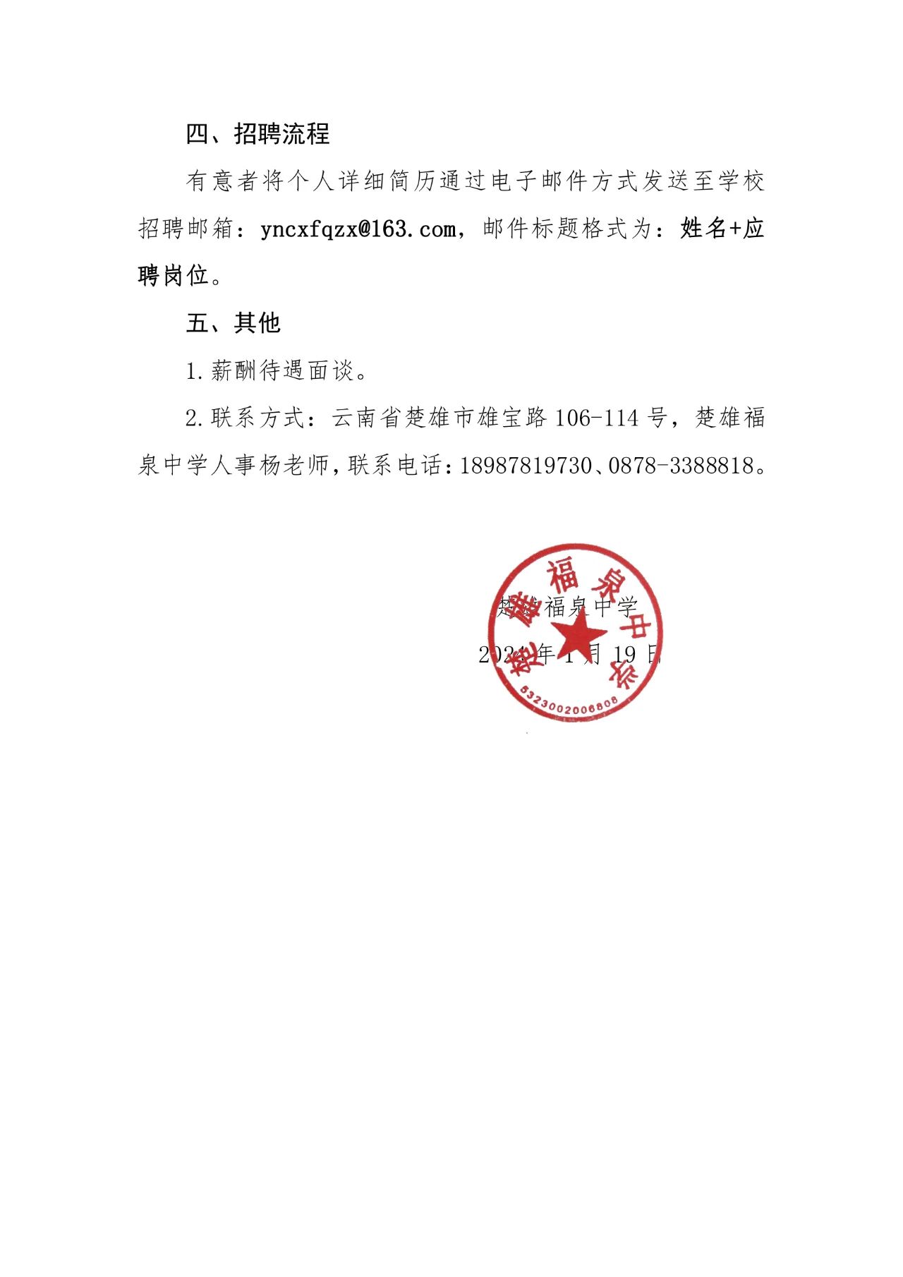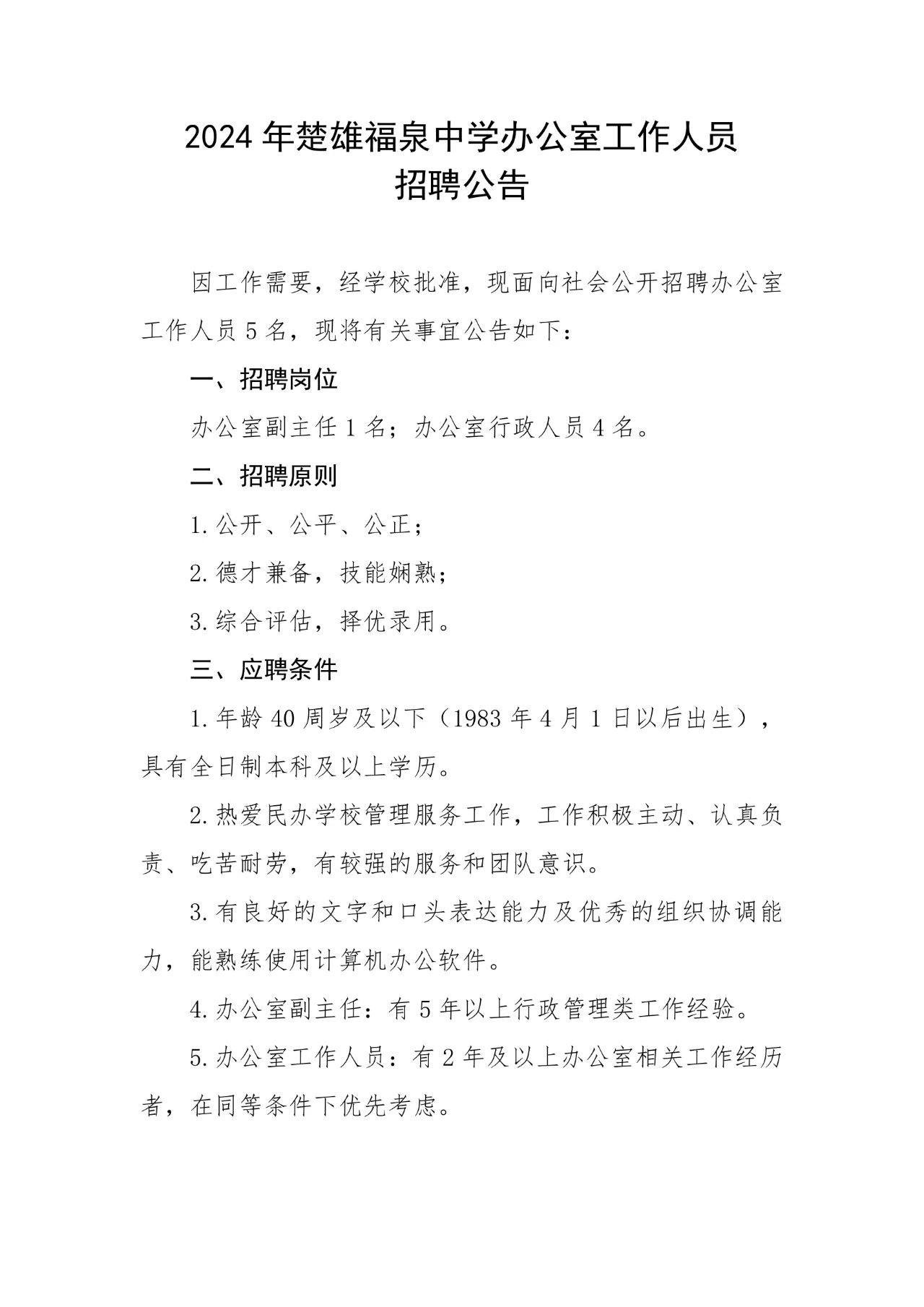2024年楚雄福泉中學(xué)辦公室工作人員招聘公告