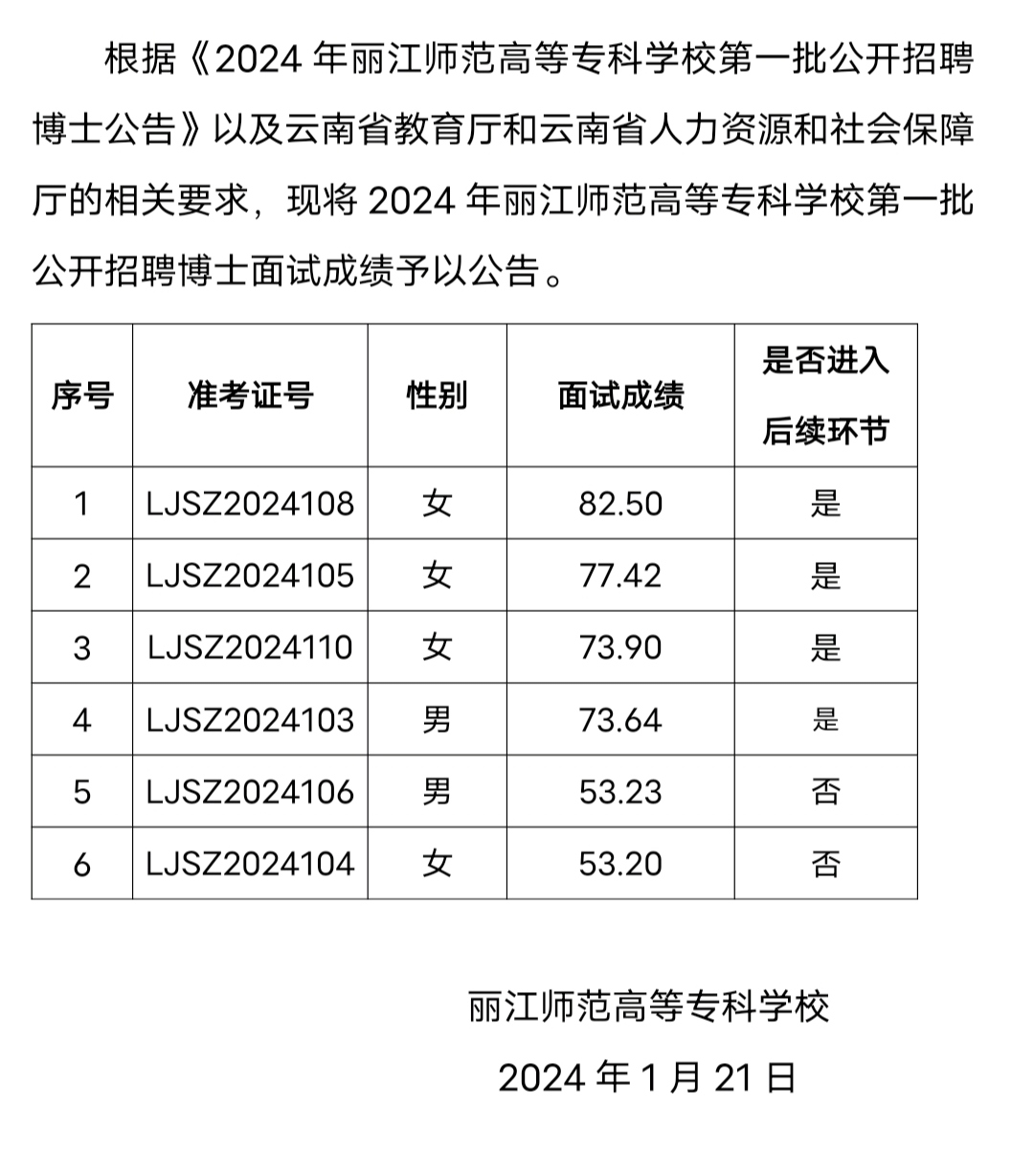 2024年麗江師范高等專科學(xué)校第一批招聘博士面試成績公告
