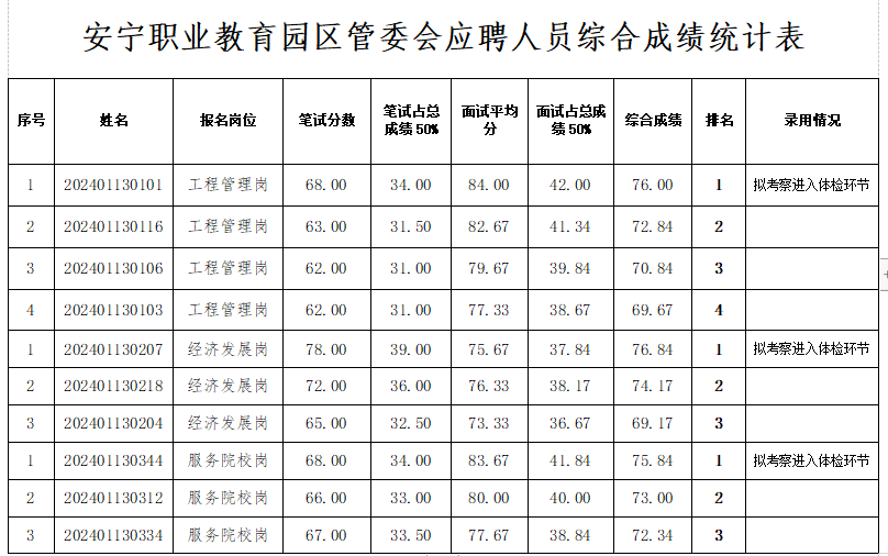 按照《安寧職業(yè)教育園區(qū)管委會編外用工人員招聘公告》招聘程序,經(jīng)前期筆試,共10名人員進(jìn)入面試。2024年1月20日,經(jīng)安寧職業(yè)教育園區(qū)管委會和安寧泰安保安有限公司組織面試,現(xiàn)將綜合分?jǐn)?shù)公示如下: