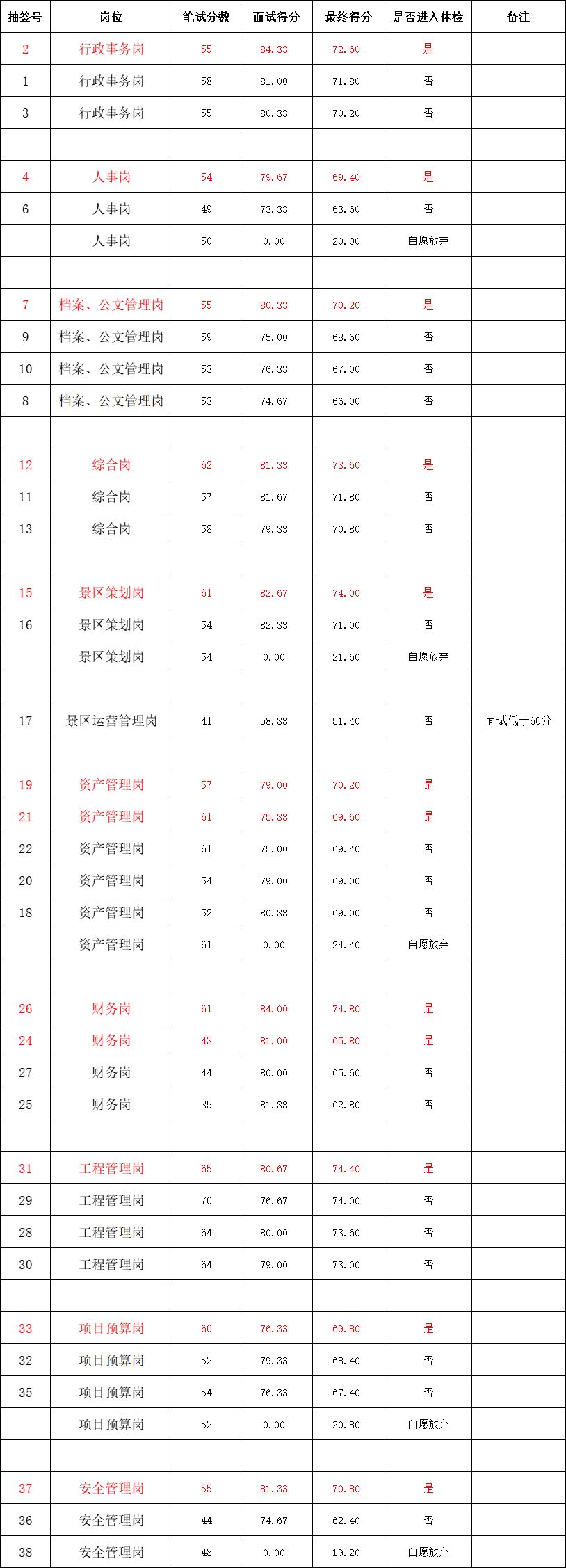 根據(jù)2023年12月22日發(fā)布的《澄江市文化旅游投資開發(fā)有限責(zé)任公司2023年公開招聘工作人員公告》,面試階段于2024年1月24日下午完成,根據(jù)招聘公告,綜合成績總分為100分,綜合成績=筆試成績×40%+面試成績×60%?,F(xiàn)將綜合成績及進(jìn)入體檢的人員名單公示如下: