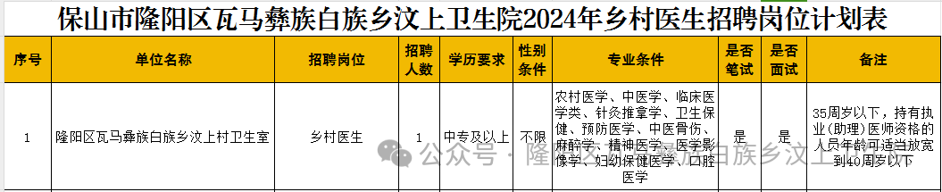 保山市隆陽區(qū)瓦馬彝族白族鄉(xiāng)汶上衛(wèi)生院2024年鄉(xiāng)村醫(yī)生招聘公告
