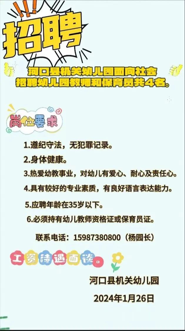 2024年紅河州河口縣機(jī)關(guān)幼兒園面向社會招聘幼兒園教師和保育員