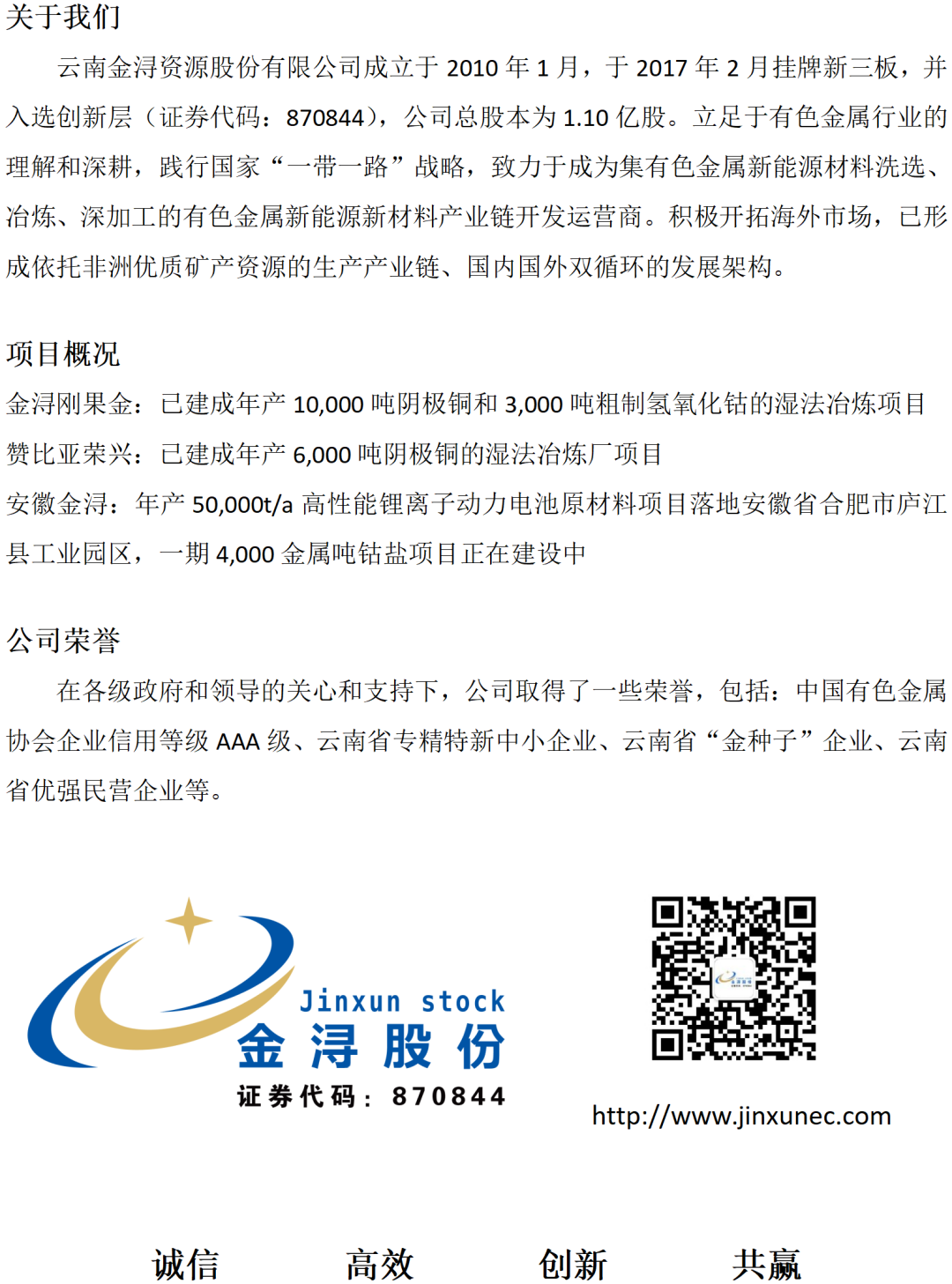 云南金潯資源股份有限公司成立于2010年1月,位于云南省昆明市高新區(qū)昌源北路1389號(hào)B幢三樓。注冊(cè)資本11029.6643萬(wàn)元,是集有色金屬新能源材料選礦、冶煉、深加工及資源綜合循環(huán)利用為一體的全產(chǎn)業(yè)鏈運(yùn)營(yíng)商。公司于2017年2月掛牌新三板,證券簡(jiǎn)稱:金潯股份,證券代碼:870844。公司發(fā)展始終與國(guó)家戰(zhàn)略同頻共振,積極響應(yīng)“一帶一路”倡議,踐行國(guó)家“走出去”戰(zhàn)略,順應(yīng)國(guó)家構(gòu)建國(guó)內(nèi)國(guó)際雙循環(huán)相互促進(jìn)的新發(fā)展格局號(hào)召,積極推動(dòng)全球化戰(zhàn)略。