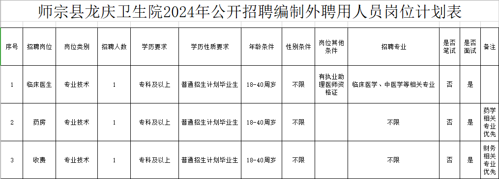 詳見附件《師宗縣龍慶衛(wèi)生院2024年公開招聘編外聘用人員計劃表》。