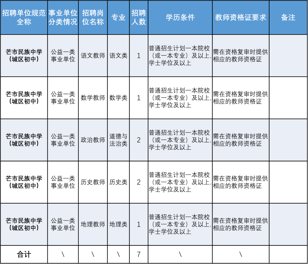 根據(jù)《德宏州人力資源和社會保障局關于印發(fā) 2024年教育衛(wèi)生部門考核招聘緊缺專業(yè)學科優(yōu)秀人才工作方案的通知》(德人社發(fā)〔2024〕2號)和《2024年芒市教育部門考核招聘緊缺專業(yè)學科優(yōu)秀人才工作方案》要求,2024年芒市民族中學(德宏州民族初級中學北校區(qū))考核招聘緊缺專業(yè)學科優(yōu)秀人才7人。