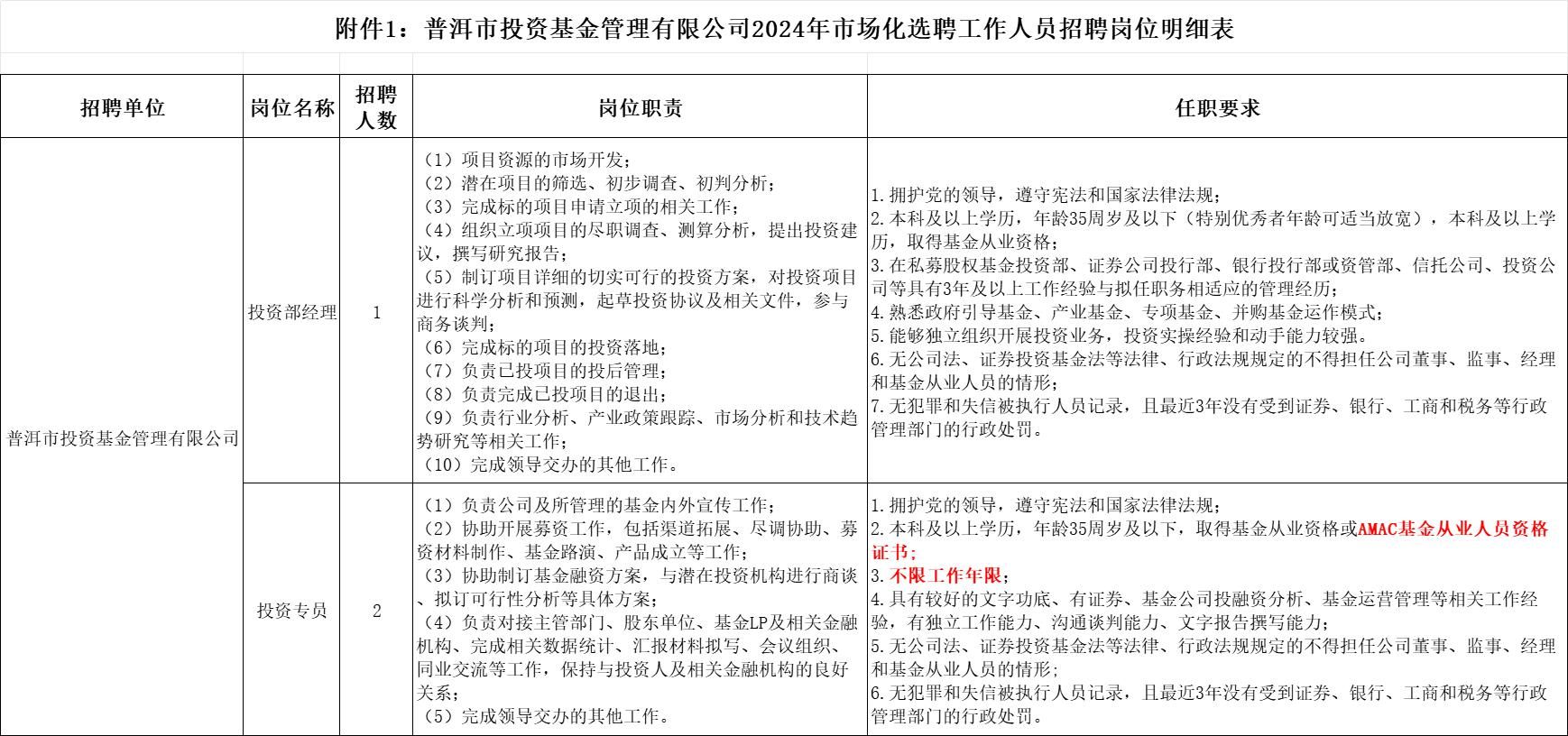 根據《普洱市投資基金管理有限公司2024年市場化選聘工作人員》的報名情況,經研究,決定:調整投資專員招聘要求,并將招聘時間延長至2024年3月1日17:30,具體如下: