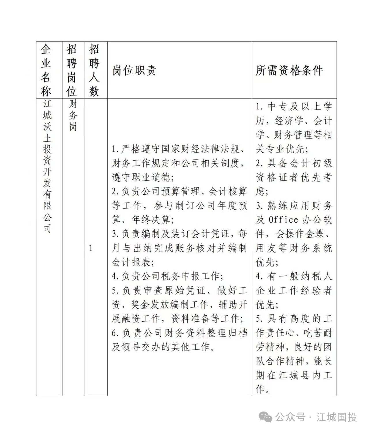 二、江城沃土投資開發(fā)有限公司關(guān)于公開招聘1名財務(wù)人員的公告