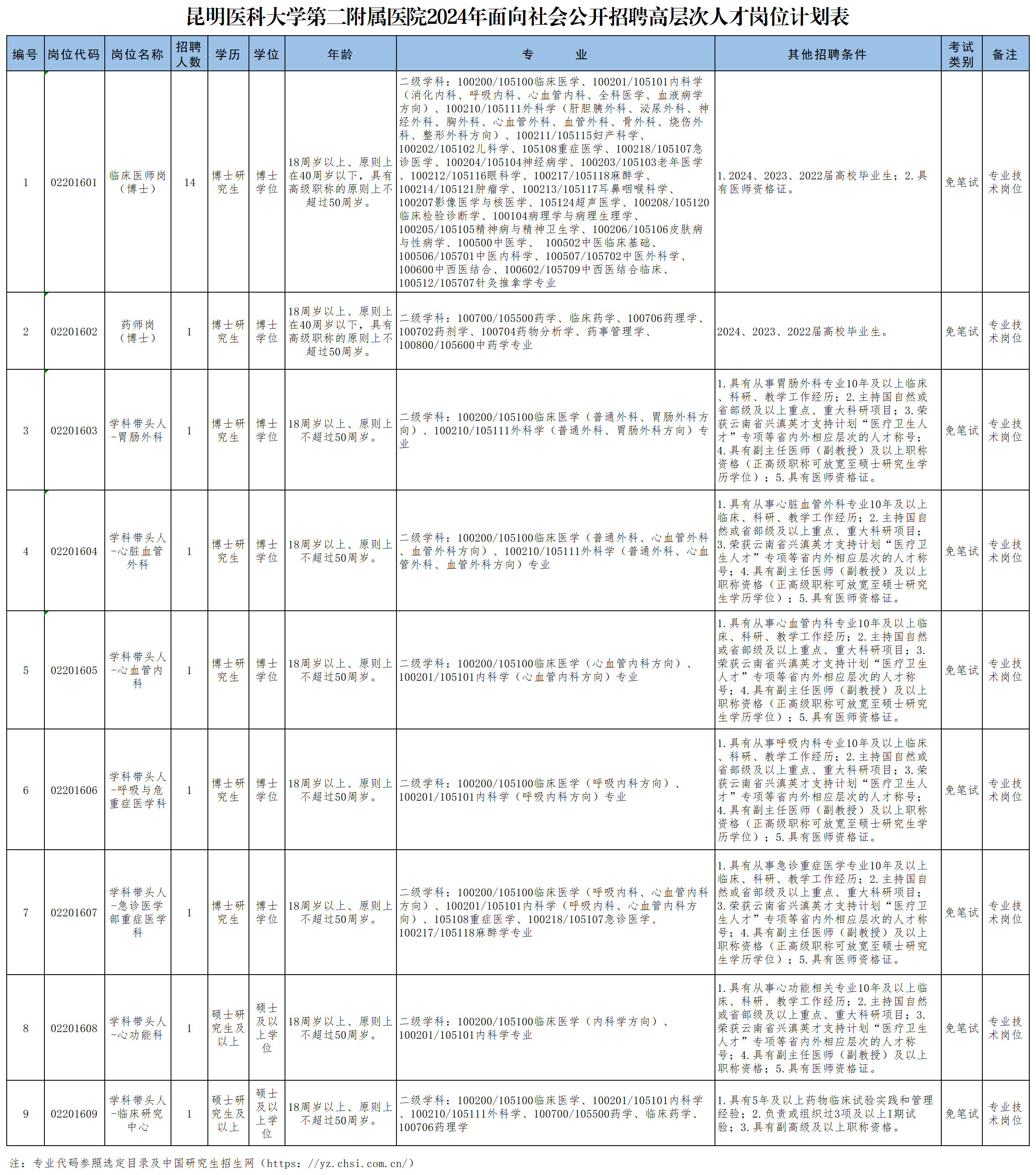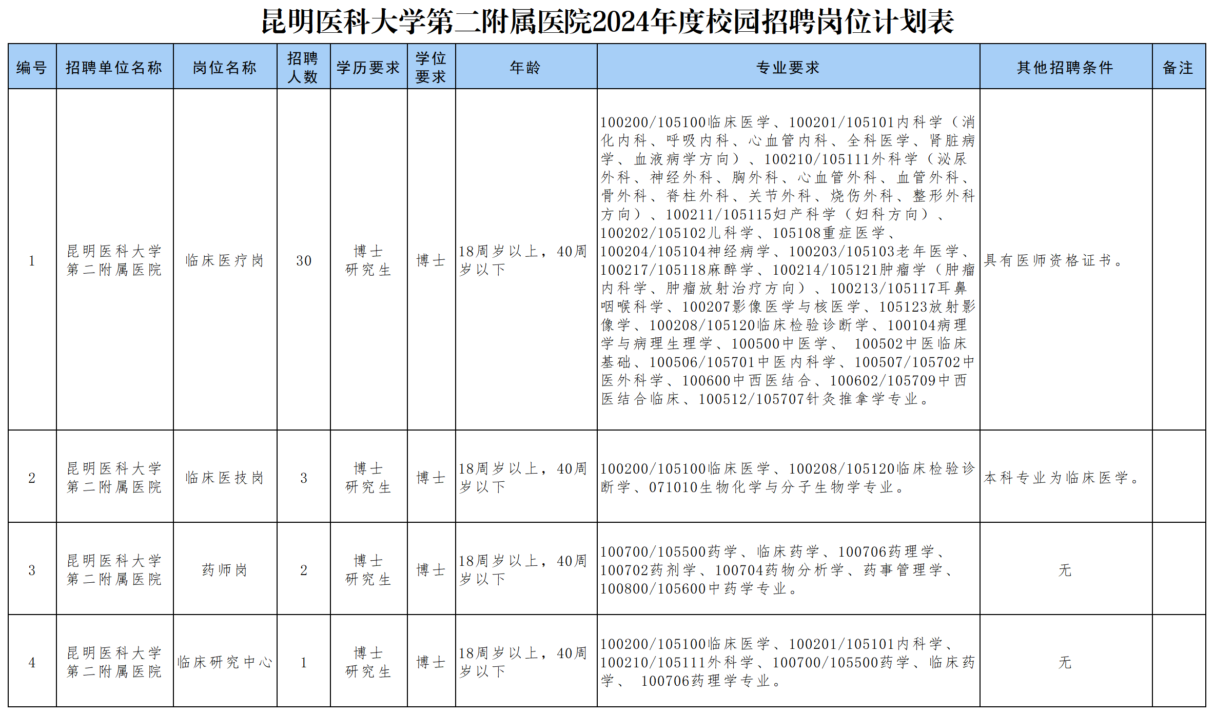 報(bào)名方式:請將個(gè)人應(yīng)聘材料原件掃描件發(fā)送至郵箱:feyrsc@126.com,郵件標(biāo)題固定格式為:2024年昆明醫(yī)科大學(xué)博士公開招聘+崗位代碼+姓名。