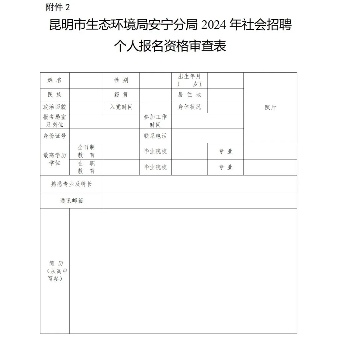 2. 昆明市生態(tài)環(huán)境局安寧分局2024年社會(huì)招聘個(gè)人報(bào)名資格審查表及同意報(bào)考證明。