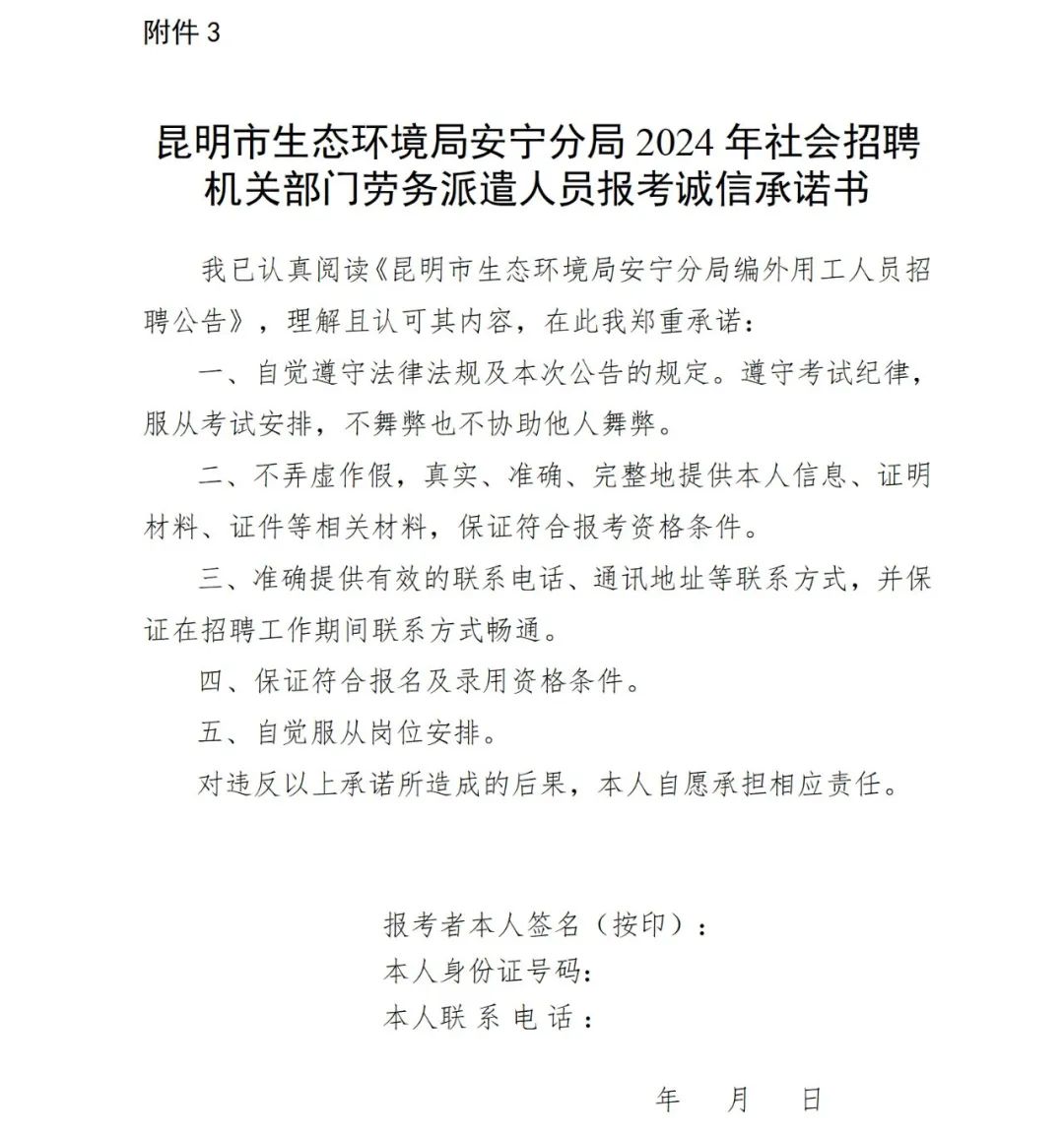 3.昆明市生態(tài)環(huán)境局安寧分局2024年社會(huì)公開招聘編外用工人員報(bào)考誠信承諾書。