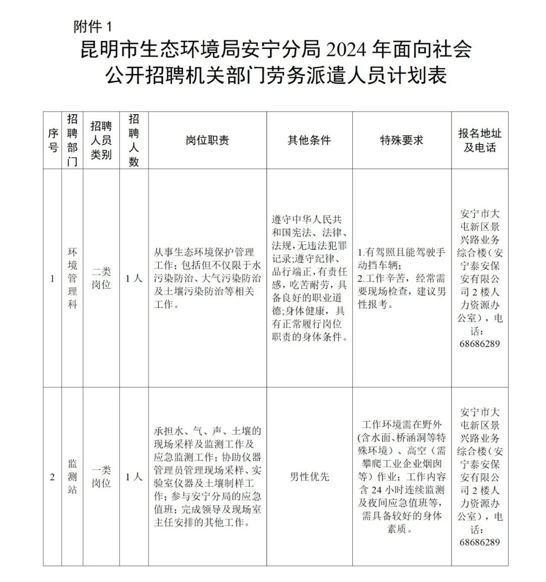 附件:1. 昆明市生態(tài)環(huán)境局安寧分局2024年面向社會(huì)公開招聘機(jī)關(guān)部門勞務(wù)派遣人員計(jì)劃表。