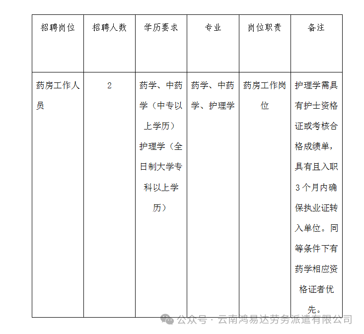 云南鴻易達(dá)勞務(wù)派遣有限公司根據(jù)晉寧區(qū)寶峰中心衛(wèi)生院委托,面向社會招聘勞務(wù)派遣人員2名,具體如下: