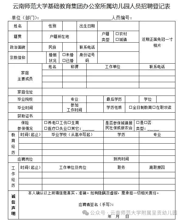 應(yīng)聘者按照招聘條件和要求,持自己的求職材料:《云南師范大學基教集團辦公室所屬幼兒園人員招聘登記表》及自薦書、簡歷、身份證等原件、復印件和有關(guān)證明材料,掃描件發(fā)送至郵箱326918729@qq.com進行報名。