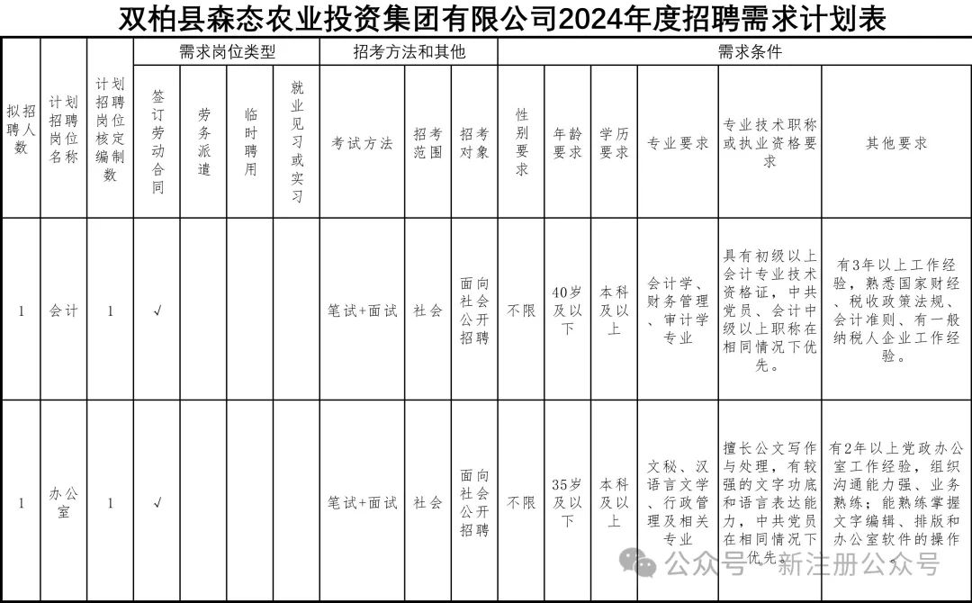 附件:雙柏縣森態(tài)農(nóng)業(yè)投資集團(tuán)有限公司公司2024年度招聘計(jì)劃表