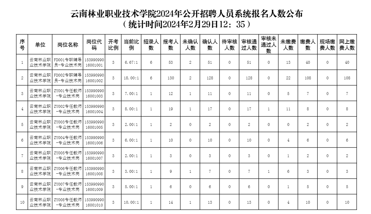 2024年云南林業(yè)職業(yè)技術學院招聘報名數據(截止2月29日12:35)