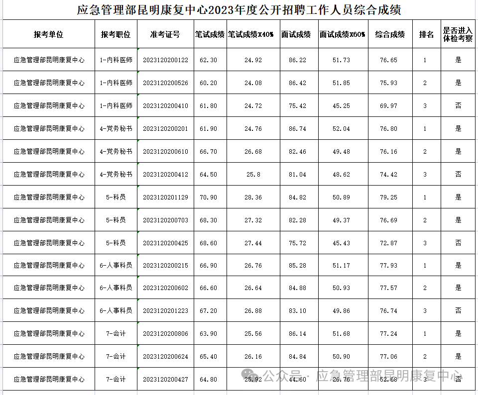 應(yīng)急管理部昆明康復中心2023年公開招聘工作人員綜合成績及體檢事宜的公告