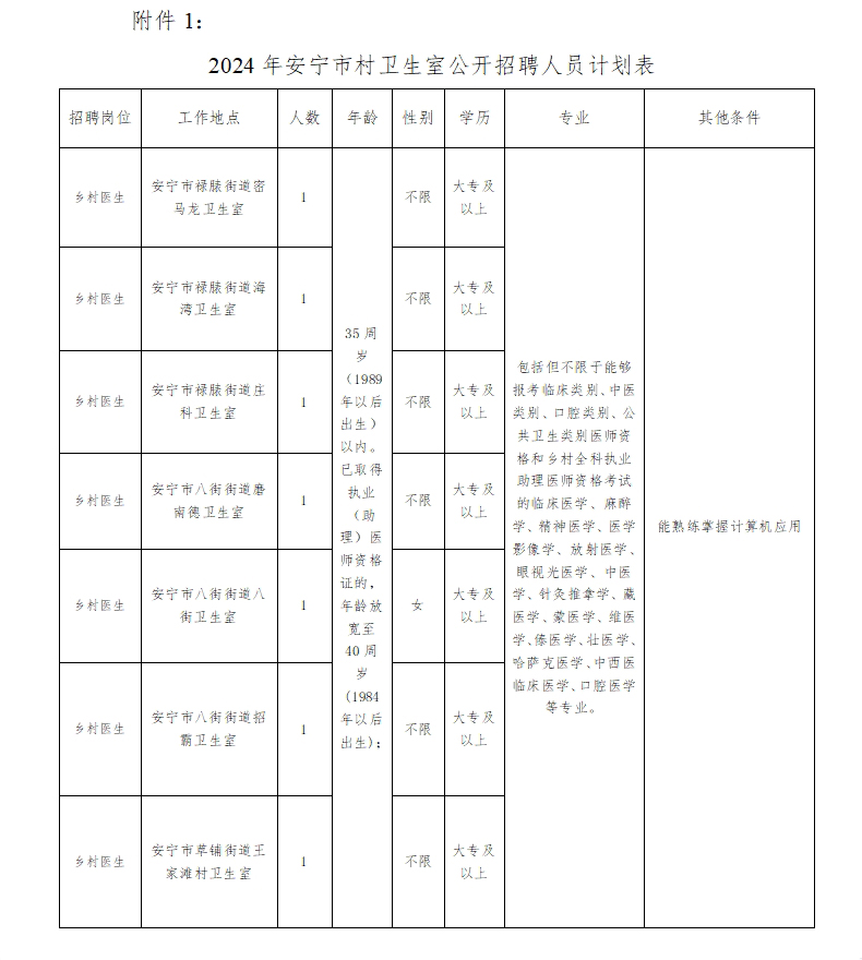 安寧市下屬3家衛(wèi)生院共公開招聘鄉(xiāng)村醫(yī)生7名。具體招聘崗位及招聘條件,詳見《2024年安寧市村衛(wèi)生室公開招聘人員計劃表》(后簡稱:《崗位計劃表》)(附件1)。