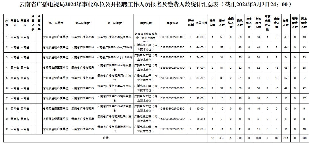 云南省廣播電視局2024年事業(yè)單位公開招聘工作人員 報名及繳費人數(shù)統(tǒng)計匯總表(截至2024年3月3日24:00) 截至2024年3月3日24:00,云南省廣播電視局已完成2024年面向社會公開招聘資格初審工作,網(wǎng)上繳費總人數(shù)為336人。