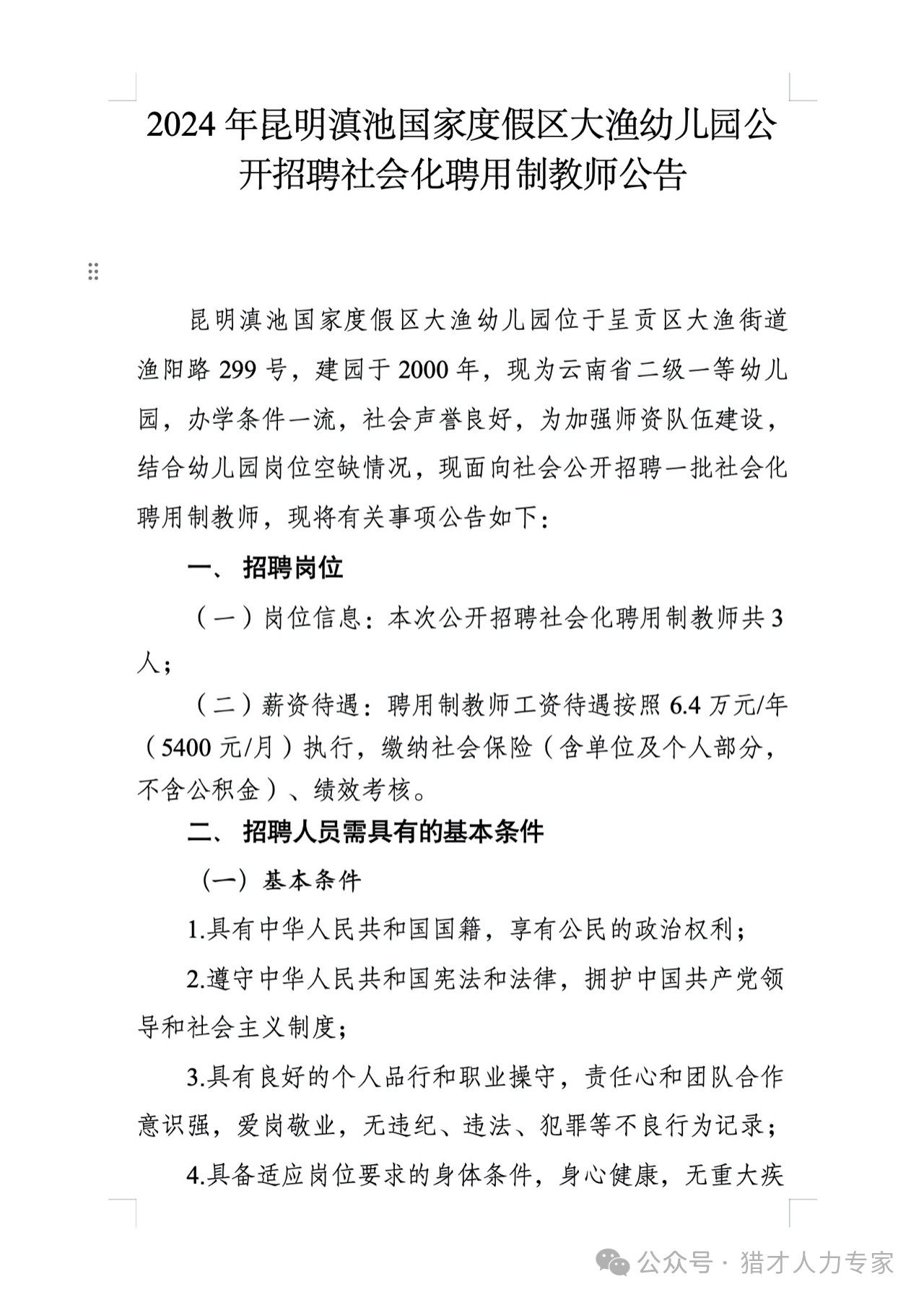 2024年昆明滇池國(guó)家度假區(qū)大漁幼兒園公開(kāi)招聘社會(huì)化聘用制教師公告
