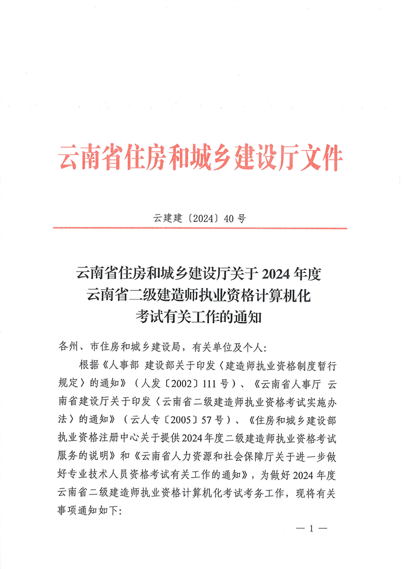 云南省住房和城鄉(xiāng)建設(shè)廳 關(guān)于2024年度云南省二級(jí)建造師執(zhí)業(yè)資格計(jì)算機(jī)化考試有關(guān)工作的通知