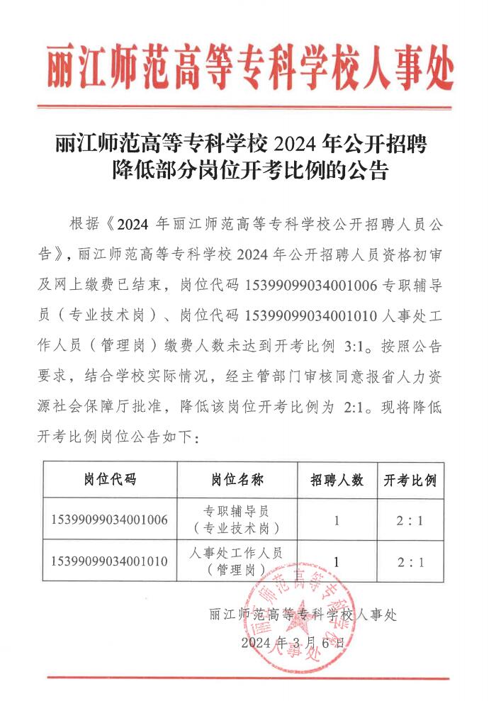 2024年麗江師范高等??茖W(xué)校招聘降低部分崗位開考比例公告