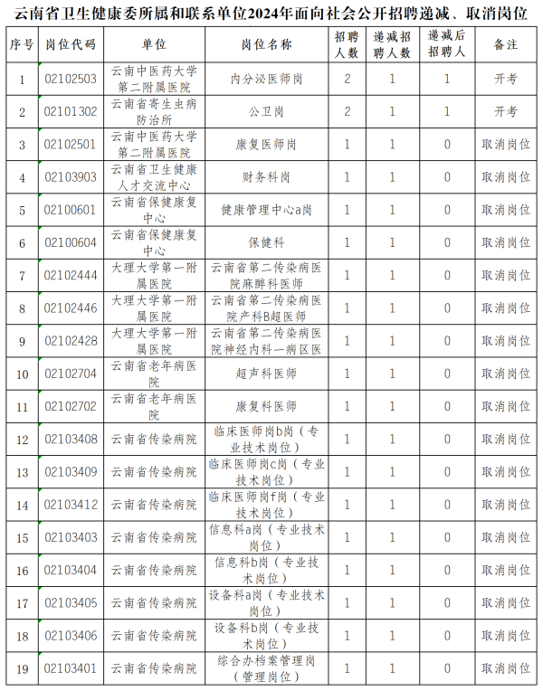 按照云南省事業(yè)單位招聘工作人員相關政策規(guī)定和《云南省衛(wèi)生健康委所屬和聯系單位2024年面向社會公開招聘工作人員公告》,因部分崗位報名及資格審核后未達到開考比例,現將遞減、取消崗位情況進行公告。取消崗位的報考人員報名費將退回本人繳費賬戶。