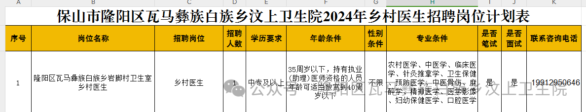 為進(jìn)一步加強(qiáng)保山市隆陽區(qū)瓦馬彝族白族鄉(xiāng)汶上衛(wèi)生院轄區(qū)各村鄉(xiāng)村醫(yī)生隊伍建設(shè),合理配備鄉(xiāng)村醫(yī)生,更好的滿足農(nóng)村居民日益增長的醫(yī)療衛(wèi)生需求,貫徹落實“強(qiáng)基層”的重要目標(biāo),推動保山市隆陽區(qū)瓦馬彝族白族鄉(xiāng)汶上衛(wèi)生院衛(wèi)生健康事業(yè)的發(fā)展,保山市隆陽區(qū)瓦馬彝族白族鄉(xiāng)汶上衛(wèi)生院決定對汶上衛(wèi)生院轄區(qū)巖腳村衛(wèi)生室鄉(xiāng)村醫(yī)生崗位進(jìn)行公開招聘,現(xiàn)將有關(guān)事項公告如下: