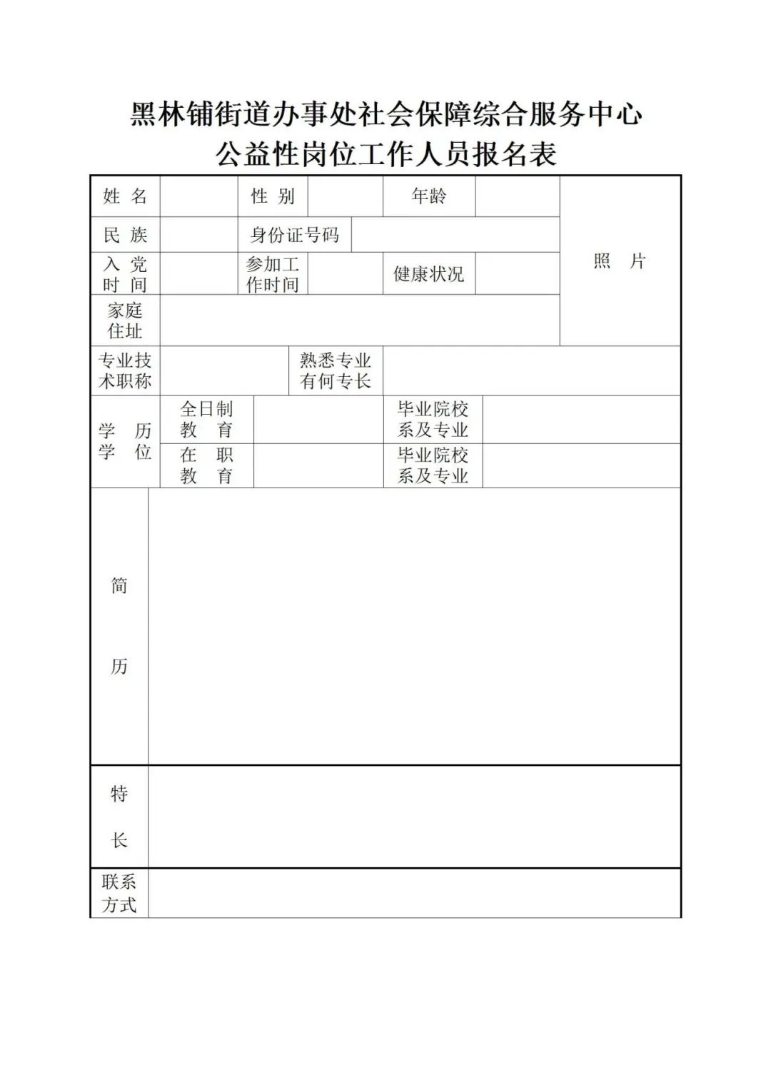 附件:黑林鋪街道辦事處社會保障綜合服務(wù)中心公益性崗位工作人員報名表