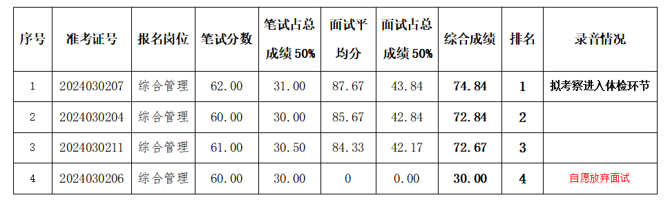 按照《安寧職業(yè)教育園區(qū)管委會編外用工招聘公告》招聘程序,于2024年3月2日上午進行筆試,共4名人員進入面試。2023年3月9日上午,經(jīng)安寧職業(yè)教育園區(qū)管委會和安寧泰安保安有限公司組織面試,現(xiàn)將綜合分數(shù)公示如下: