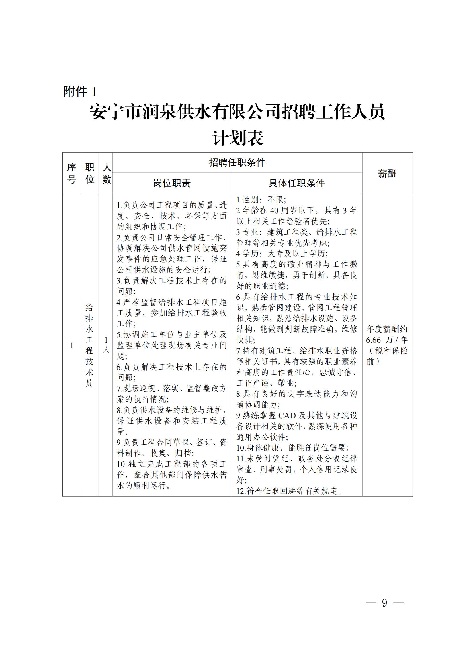 附件:1.安寧市潤泉供水有限公司招聘工作人員計劃表