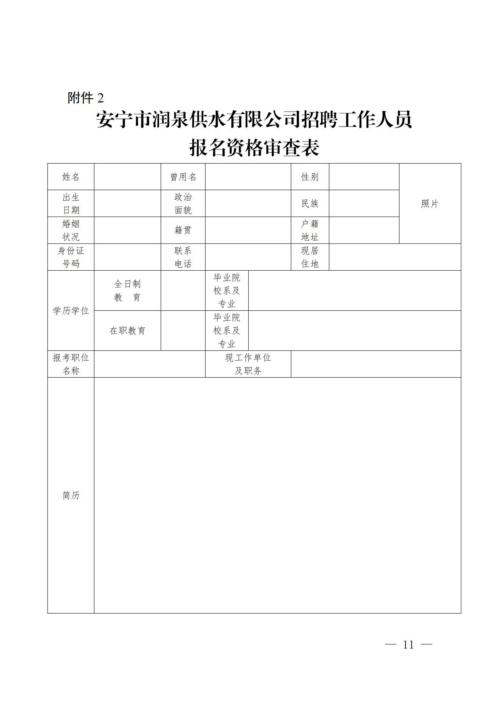 2.安寧市潤泉供水有限公司招聘工作人員報名資格審查表