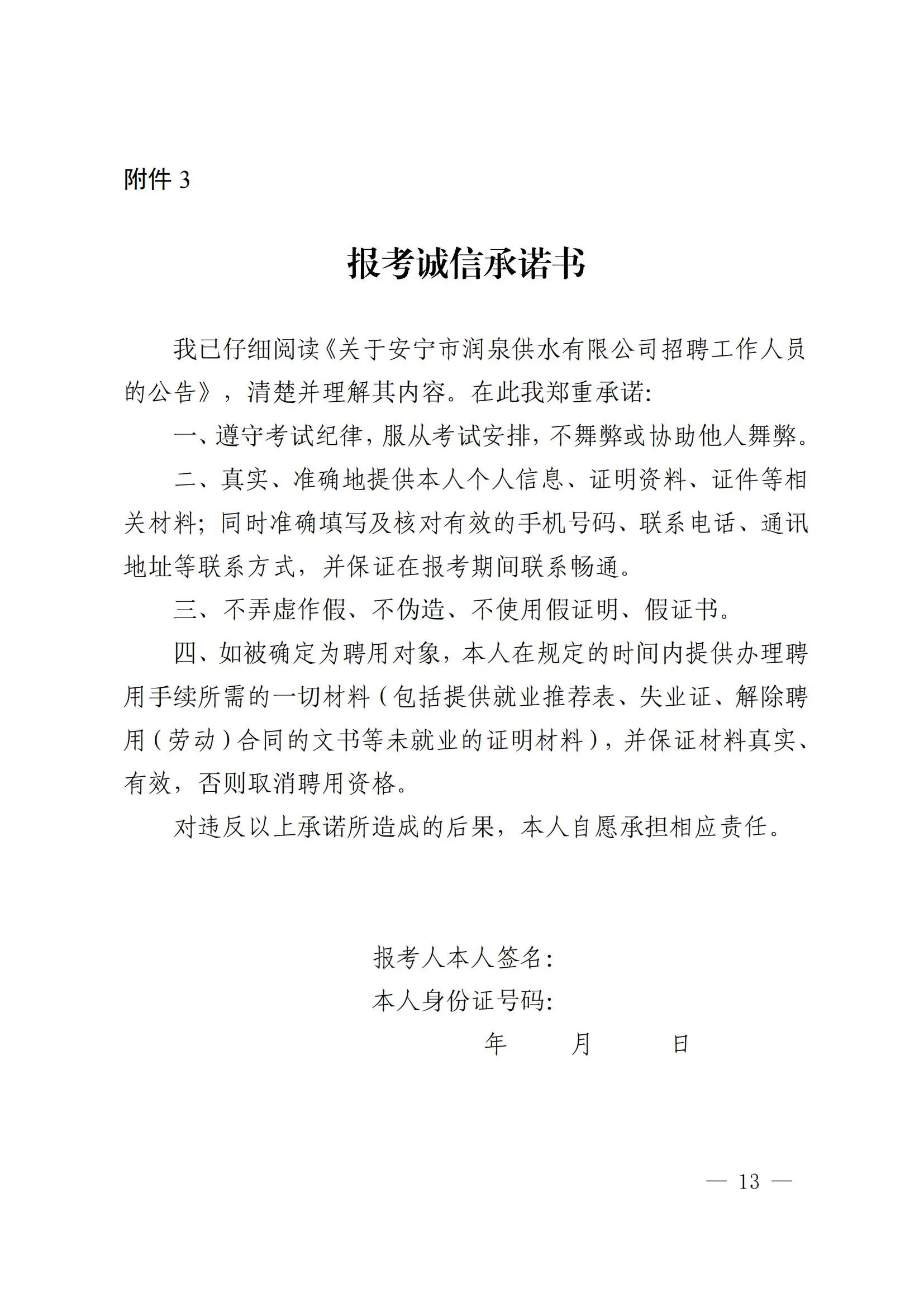 4.報名及資格審核方式:采取線下集中報名審查的方式進(jìn)行,每人只限報考一個崗位。報名人員須填寫《安寧市潤泉供水有限公司招聘人員報名資格審查表》(以下簡稱“報名資格審查表”,詳見附件2)、報考誠信承諾書(詳見附件3),并仔細(xì)核對填報信息,報名信息一經(jīng)審查通過,不允許作任何修改,因信息不實(shí)造成后續(xù)環(huán)節(jié)出現(xiàn)問題的,后果由報名者自行承擔(dān)。