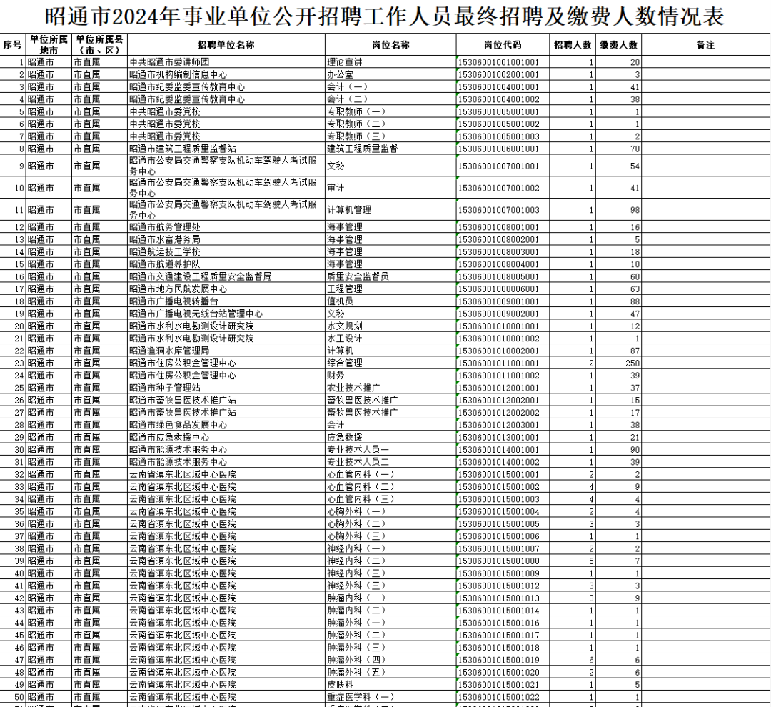 2024年昭通市事業(yè)單位招聘最終招聘及繳費人數(shù)情況表