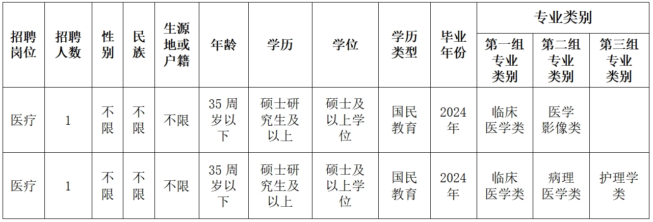 高等院校醫(yī)學(xué)類本科及以上學(xué)歷畢業(yè)后直接參加國家計劃內(nèi)住院醫(yī)師規(guī)范化培訓(xùn),2024年國家住院醫(yī)師規(guī)范化培訓(xùn)合格且具有國家執(zhí)業(yè)醫(yī)師資格,參加醫(yī)療衛(wèi)生行業(yè)招聘醫(yī)學(xué)類崗位的,視為2024年度應(yīng)屆畢業(yè)生(資格復(fù)審時須提供成績單、合格證明,否則取消聘用資格)。