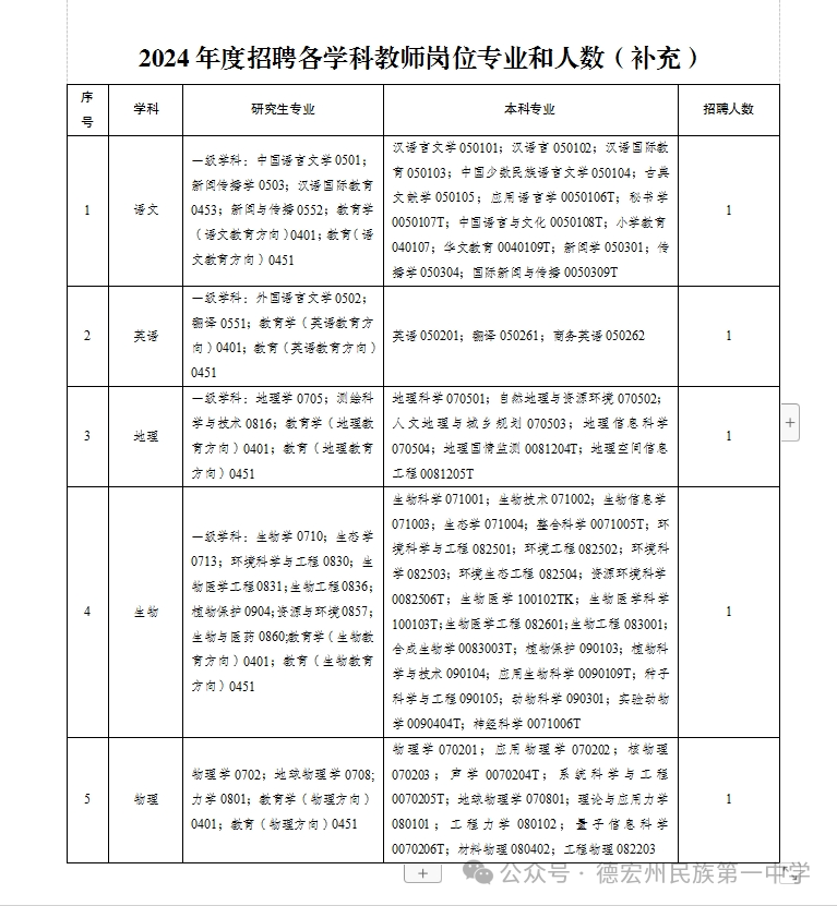 根據(jù)《德宏州人民政府關(guān)于德宏州教育衛(wèi)生部門(mén)考核招聘緊缺專(zhuān)業(yè)學(xué)科優(yōu)秀人才實(shí)施意見(jiàn)的批復(fù)》(德政復(fù)〔2009〕31號(hào))和州委編辦2023-01《關(guān)于同意下屬事業(yè)單位選優(yōu)的批復(fù)》《德宏州人力資源和社會(huì)保障局關(guān)于印發(fā)2024年教育衛(wèi)生部門(mén)考核招聘緊缺專(zhuān)業(yè)學(xué)科優(yōu)秀人才工作方案的通知》(德人社發(fā)〔2024〕2號(hào))文件要求,結(jié)合我校實(shí)際,經(jīng)研究,現(xiàn)將2024年德宏州民族第一中學(xué)考核招聘緊缺專(zhuān)業(yè)學(xué)科優(yōu)秀人才相關(guān)事宜補(bǔ)充公告如下: