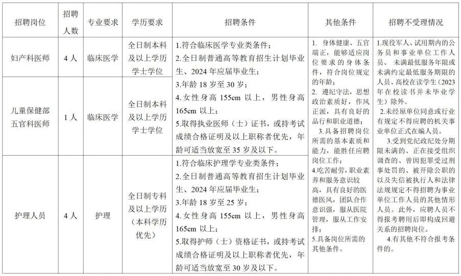 確實(shí)因工作需要 ,2024年應(yīng)屆畢業(yè)的臨床醫(yī)學(xué)專業(yè)類、 口腔醫(yī)學(xué)專業(yè)類、醫(yī)學(xué)影像學(xué)專業(yè)類及其他專業(yè)技術(shù)人員,有學(xué)習(xí)成績優(yōu)秀、“德、能、勤、績”工作突出可無證破格聘用,但要求須在 3 年內(nèi)取得相應(yīng)專業(yè)技術(shù)資格證書和執(zhí)業(yè)資格證書,否則解聘。