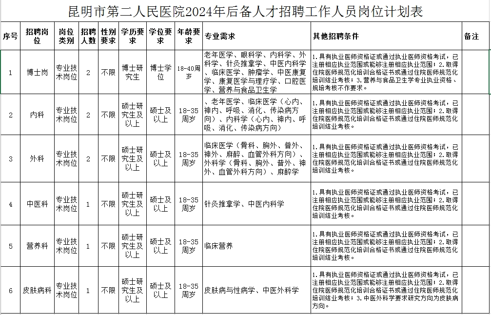 本次共招聘9人。具體招聘崗位及招聘條件詳見《昆明市第二人民醫(yī)院2024年后備人才招聘工作人員崗位計劃表》(以下簡稱《崗位計劃表》),可通過昆明市衛(wèi)生健康委員會官網(wǎng)(wsjkw.km.gov.cn)、昆明衛(wèi)生人才網(wǎng)(www.kmwsrc.com.cn)查詢詳細(xì)信息。
