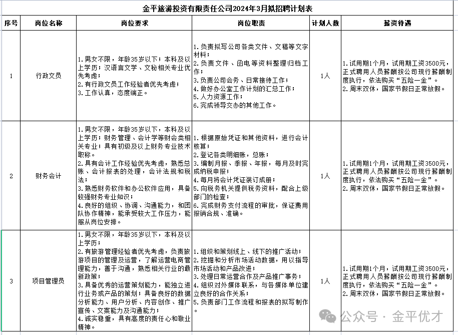 本次計劃招聘,詳見《金平旅游投資有限責(zé)任公司2024年3月擬招聘計劃表》(附件1)。