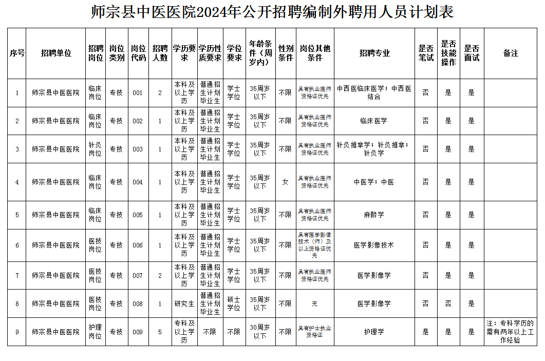 附件:1、師宗縣中醫(yī)醫(yī)院2024年公開招聘編制外聘用人員計(jì)劃表