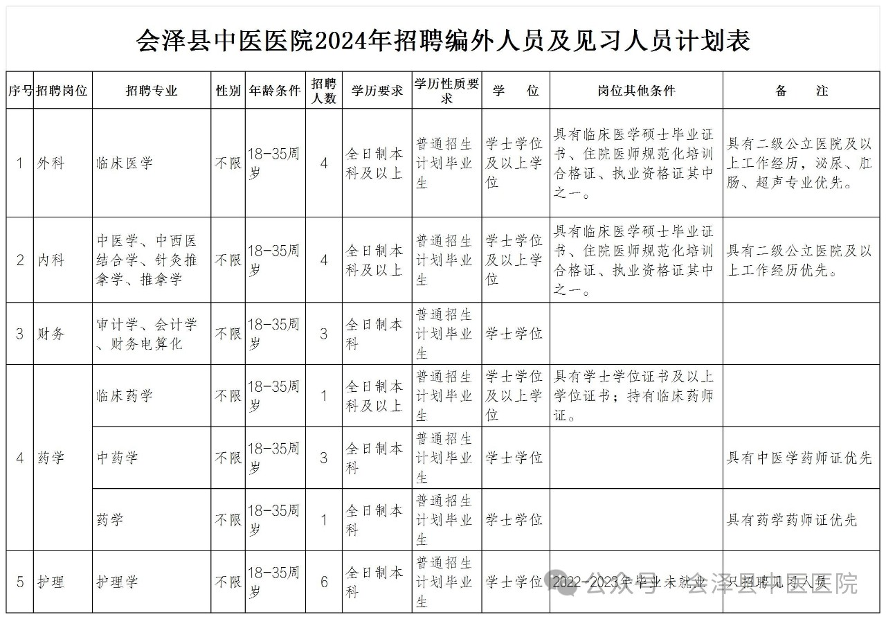 招聘計劃和資格條件要求詳見《會澤縣中醫(yī)院2024年公開招聘編外人員及見習(xí)人員計劃表》(附件1)