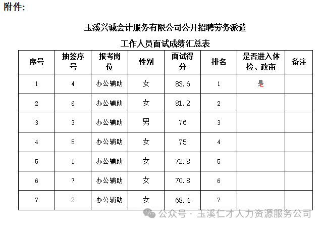 附件:玉溪興誠會(huì)計(jì)服務(wù)有限公司公開招聘勞務(wù)派遣工作人員公告面試成績(jī)匯總表