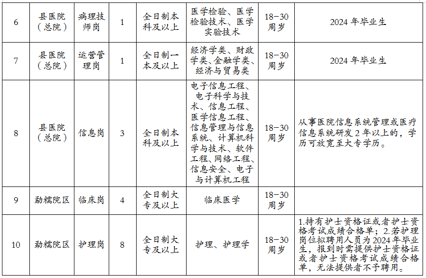 本次計劃招聘53名工作人員,其中,縣人民醫(yī)院(總院)31人、縣人民醫(yī)院勐糯院區(qū)22人。