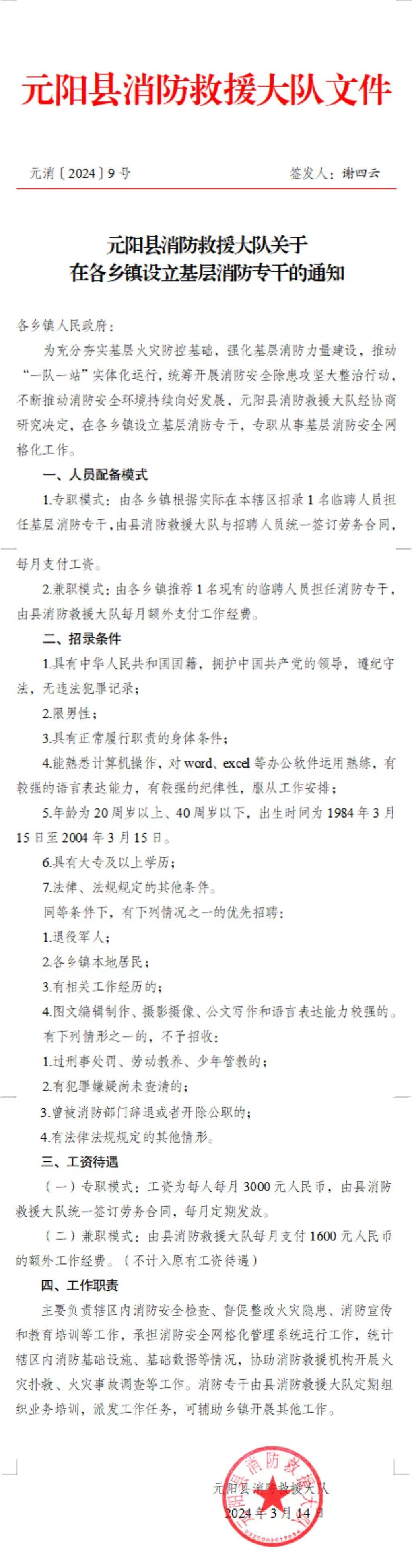 為充分夯實(shí)基層火災(zāi)防控基礎(chǔ),強(qiáng)化基層消防力量建設(shè),推動(dòng)“一隊(duì)一站”實(shí)體化運(yùn)行, 統(tǒng)籌開(kāi)展消防安全除患攻堅(jiān)大整治行動(dòng),不斷推動(dòng)消防安全環(huán)境持續(xù)向好發(fā)展,根據(jù)《元陽(yáng)縣消防救援大隊(duì)關(guān)于在各鄉(xiāng)鎮(zhèn)設(shè)立基層消防專(zhuān)干的通知》(元消〔2024〕9號(hào)文件)要求,現(xiàn)招錄1名臨聘人員擔(dān)任基層消防專(zhuān)干,專(zhuān)職從事基層消防安全網(wǎng)格化工作?,F(xiàn)將有關(guān)事項(xiàng)公告如下: