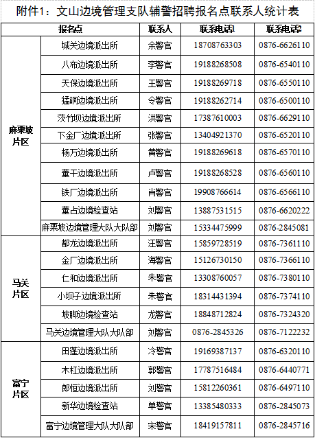 附:1.文山邊境管理支隊(duì)輔警招聘報(bào)名點(diǎn)聯(lián)系方式